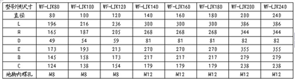 注:其中孔徑為¢M,長為L高為H厚度為D,地腳中心距為E,B、C為四孔間尺寸,¢8.5孔為通孔,可做水平安裝用。