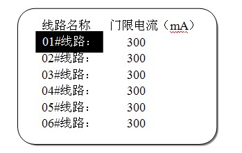 本菜單設置線路的門限電流。當線路的一次側電流小于門限電流時,該條線路不參與選線。按左右鍵翻頁,按上下方向鍵移動光標選擇需修改的參數(shù)項。按確認鍵進入修改狀態(tài),此時按方向鍵修改參數(shù)。修改后按“確認”鍵保存,按“取消”鍵不做保存。