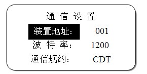 本菜單設置通信參數(shù),按上下方向鍵移動光標選擇需修改的參數(shù)項,按確認鍵進入修改狀態(tài),此時按方向鍵修改參數(shù),修改后按“確認”鍵保存,按“取消”鍵不做保存。